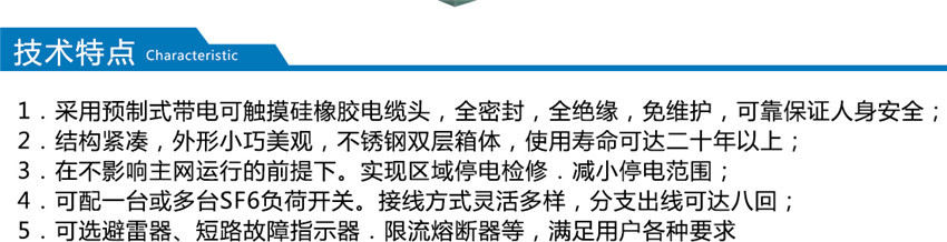 以其优良的性能,规范化的设计,优美的外观,广泛应用于电缆配电网系统中的电缆化工程设备,在各大工业园区,居民小区,城市人口密集区,商业中心以及高层建筑等各种场所得到普遍认同。它以单向开门、横向多通母排为主要特点,具有宽度小、组合灵活、全绝缘、全密封等显著优点。按照额定电流一般可以分为600A主回路和200A支回路两种。600A主回路采用旋入式螺栓固定连接;200A分支回路采用拔插式连接,且可以带负荷拔插。
