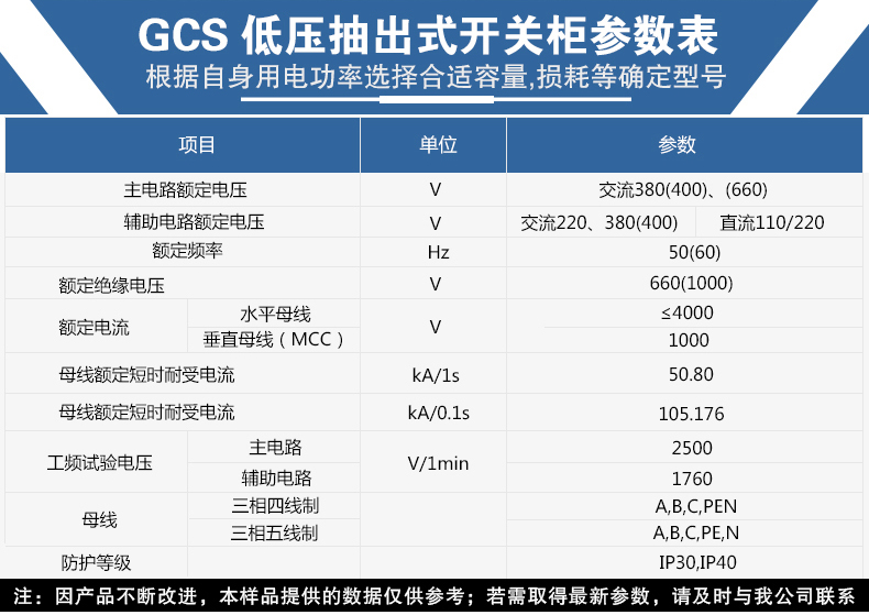 GCS是抽屉式低压配电柜,额定频率是50(60)HZ,额定工作电压380(660)V,额定工作电流至 =< 4000A。