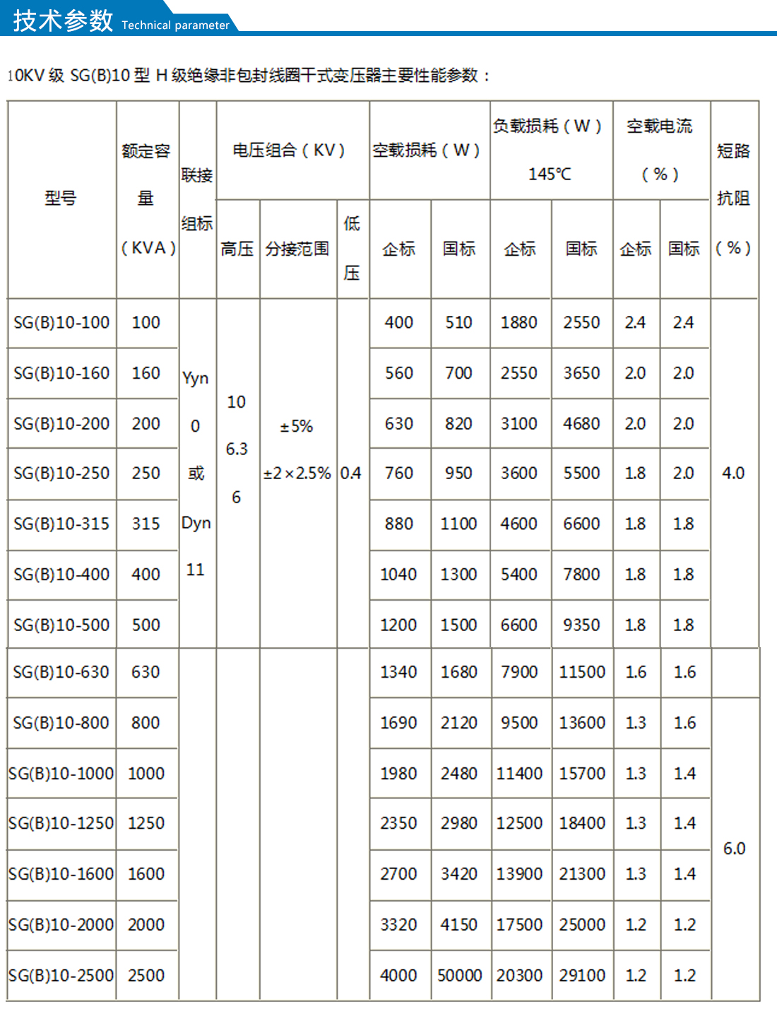 根据不同的使用环境,可配置不同的防护等级. 变压器可按用户需要带有温度控制和温度显示系统,可和温控系统配合使用。 使用环境:户内使用 正常使用条件:海拔不超过1000m?;肪澄露茸罡?+40℃, 最低气温 -30℃ ,最高年平均气温 +20℃ (若与上述条件不符时,订货时详细说明, 可按相应标准的有关规定,作适当的调整) 产品执行标准 GB1094.1~2-1996电力变压器 GB1094.3.5-2003电力变压器 GB1094.4-2005电力变压器 GB1094.11-2007干式电力变压器 GB/T 10228-2008干式电力变压器技术参数和要求。