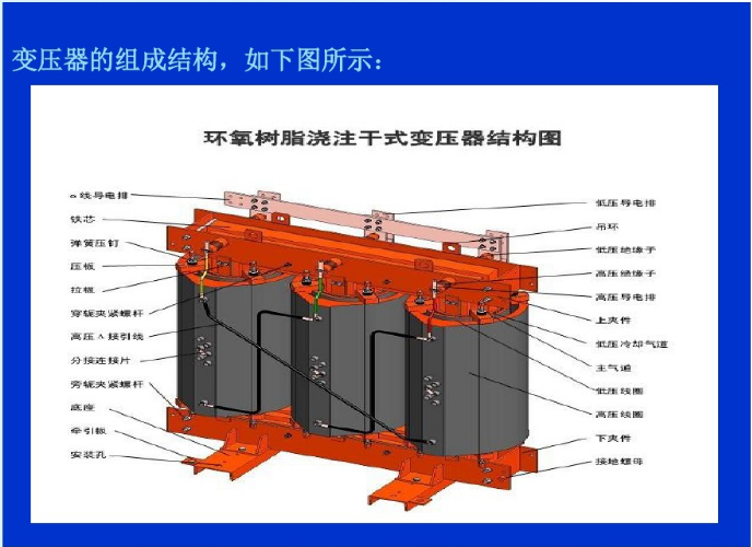 ⒊浇注式:用环氧树脂或其它树脂浇注作为主绝缘,它结构简单、体积小,适用于较小容量的变压器。