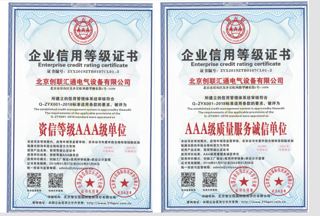 近日,倍受业内关注的2018年度中AAA级重质量守信用企业复审在北京落幕,中市场监测中心联合中市场研究中心等多家机构以及企业评审委员会组织专家对申报复审的中AAA级重质量守信用企业等殊荣进行综合评价。北京创联汇通电气设备有限公司经中产业质量调查评价中心、中企业信用评价管理中心等机构审核,再次被评为“中AAA级信用企业”荣誉称号。