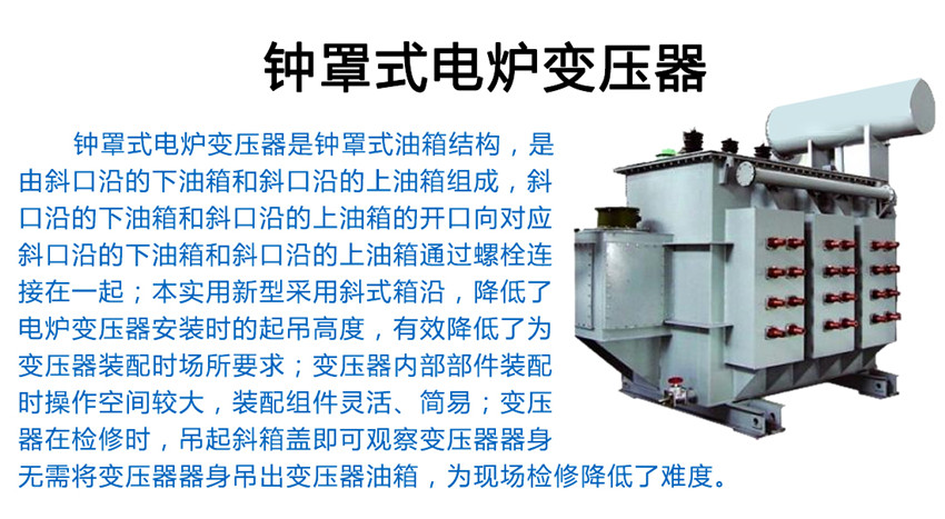 电炉变压器斜钟罩式油箱结构,是由斜口沿的下油箱和斜口沿的上油箱组成,斜口沿的下油箱和斜口沿的上油箱的开口向对应,斜口沿的下油箱和斜口沿的上油箱通过螺栓连接在一起;本实用新型采用斜式箱沿,降低了电炉变压器安装时的起吊高度,有效降低了为变压器装配时场所要求;变压器内部部件装配时操作空间较大,装配组件灵活、简易;变压器在检修时,吊起斜箱盖即可观察变压器器身,无需将变压器器身吊出变压器油箱,为现场检修降低了难度。