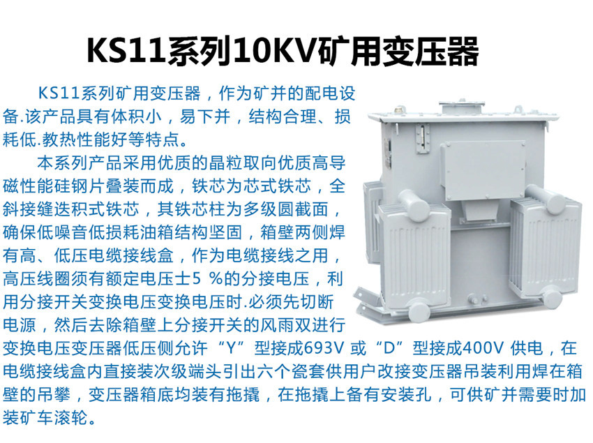 KS11变压器适用于煤矿井下中央变电所、井底车场、总进风道和主要进风道,虽有瓦斯但无爆炸危险的场所。也适用于隧道比较潮湿的环境中