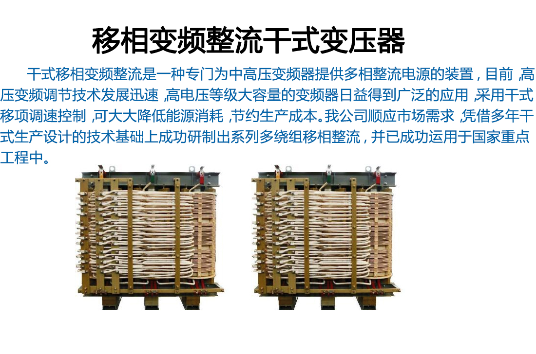 移相整流干式变压器市场近年来呈现出良好的发展势头。由于其能实现大功率高压电机的软起动及改善网侧的电流波形、消除电网谐波污染及提高负载下功率因数等诸多独特效果,在降低能源消耗及用电量方面效果显著,因此,在电力、冶金、矿山、市政、石油、化工和建材等行业已成功得到普及应用。