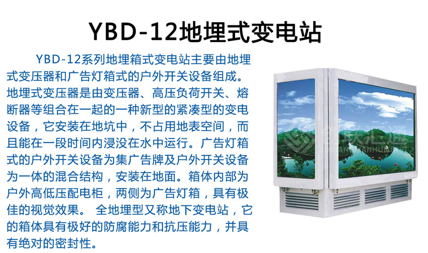 YBD-12系列地埋箱式变电站(简称地埋式箱变),是在充分研究和探讨现代城市建设和管理的基础上,新开发出的新一代箱式变。其主体部分或全部埋入地下,占地很少,甚至不占地,视觉效果非常好,有效解决了城市用地紧张和城市牛皮癣的矛盾,与周边环境和谐统一,备受广大专家和用户的推崇。地埋箱式变电站是指该箱式变电站的成套装置全部安装于一个全密封的箱体内部并把整体设制于地平面以下,它和地面上箱式变电站,内部设备是相同的,同样是由10KV输入电压经变压器降为400/220V配电电压再送配至使用负荷点,可用于环网配电系统,也可作为放射式电网终端供电的变电站。这种全地埋型又称地下变电站,它的箱体具有极好的防腐能力和抗压能力,并具有绝对的密封性。