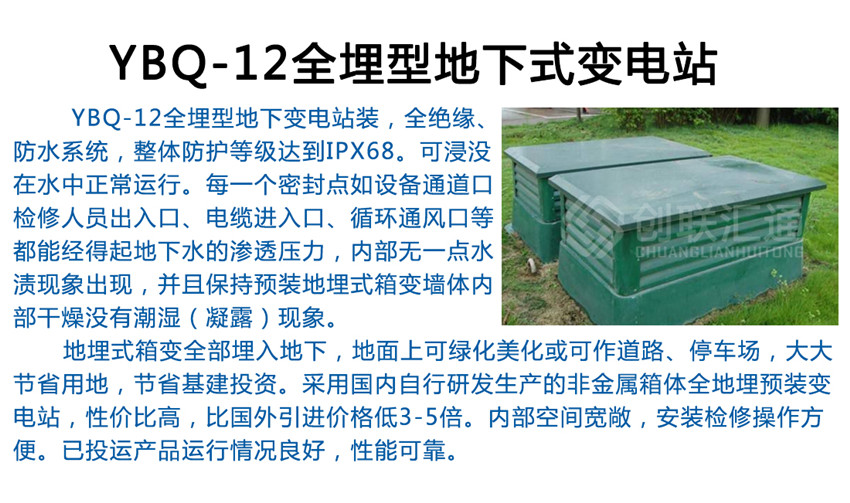 YBDM-12系列地埋箱式变电站(简称地埋式箱变),是在充分研究和探讨现代城市建设和管理的基础上,新开发出的新一代箱式变。其主体部分或全部埋入地下,占地很少,甚至不占地,视觉效果非常好,有效解决了城市用地紧张和城市牛皮癣的矛盾,与周边环境和谐统一,备受广大专家和用户的推崇。地埋箱式变电站是指该箱式变电站的成套装置全部安装于一个全密封的箱体内部并把整体设制于地平面以下,它和地面上箱式变电站,内部设备是相同的,同样是由10KV输入电压经变压器降为400/220V配电电压再送配至使用负荷点,可用于环网配电系统,也可作为放射式电网终端供电的变电站。这种全地埋型又称地下变电站,它的箱体具有极好的防腐能力和抗压能力,并具有绝对的密封性。
