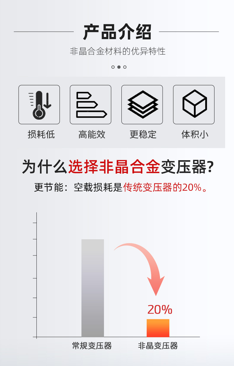 该变压器的铁芯采用非晶合金材料,相比传统的硅钢片材料,其磁导率高,铁损耗低,磁饱和感低,从而使得变压器的效率得到了进一步提高。另外,非晶合金材料在加工时可以制成形状各异的薄带状材料,铁芯损耗低,结构紧凑,提高了变压器的功率密度,进一步减小了变压器的体积和重量。
