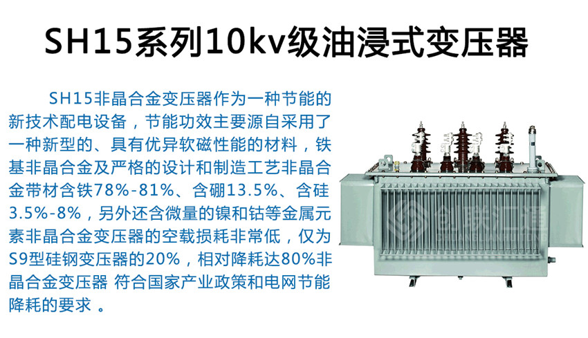 SH15非晶合金油浸式变压器可用于高层建筑、商业中心、地铁、机场、车站、工矿企业和发电厂,特别适用易燃、易爆和防火要求高的场所。因此,非晶合金变压器是户内供电网络中最理想的节能型配电设备.